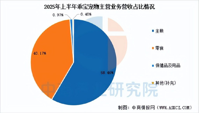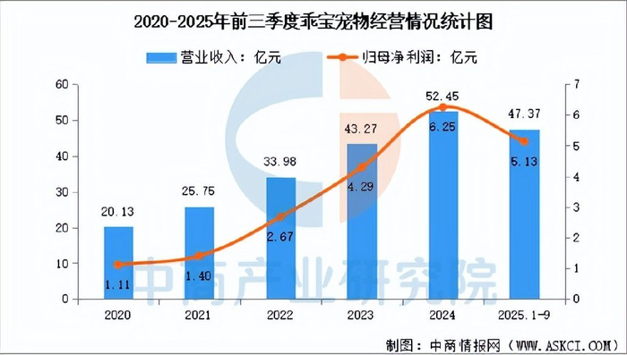2025年前三季度,乖宝宠物营业收入为47.37亿元,同比增长29.03%,归母净利润为5.13亿元,同比增长9.05%。上半年,公司宠物主粮收入18.83亿元,占比58.46%,宠物零食收入12.94亿元,占比40.17%,宠物保健品及用品收入3132万元,占比0.97%。