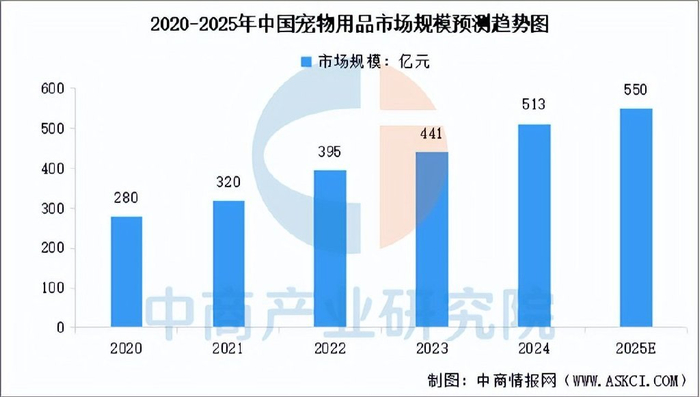 宠物用品是指满足宠物日常“衣食住行”及健康、娱乐所需的所有非食品类产品。它已成为宠物经济中增长最迅速的板块之一,尤其在智能化和个性化方面表现突出。中商产业研究院发布的《2025-2030年中国宠物经济市场前景预测及未来发展趋势报告》显示,2024年中国宠物用品市场规模达到513亿元,较上年增长16.33%。中商产业研究院分析师预测,2025年中国宠物用品市场规模将达到550亿元。