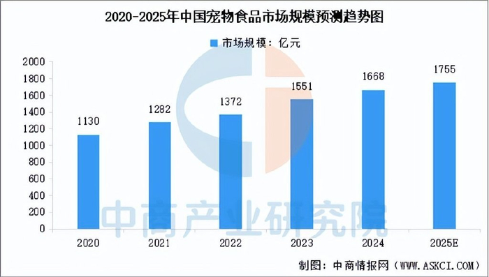 宠物食品贯穿宠物的整个生命周期,是宠物消费的刚性需求和核心部分,也是宠物行业最大的细分行业。中商产业研究院发布的《2025-2030年中国宠物经济市场前景预测及未来发展趋势报告》显示,2024年中国宠物食品市场规模达到1668亿元,较上年增长7.54%。中商产业研究院分析师预测,2025年中国宠物食品市场规模将达到1755亿元。