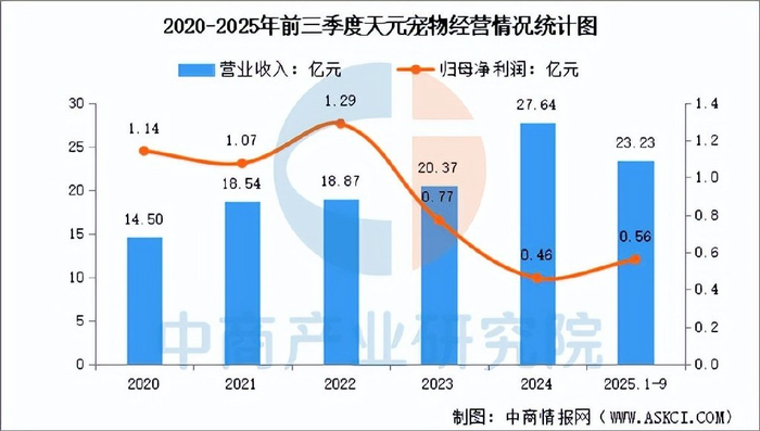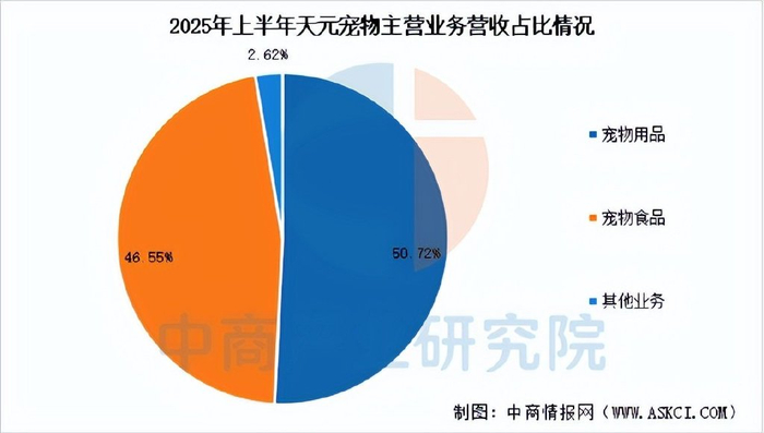 2025年前三季度,天元宠物实现营业总收入23.23亿元,同比增长14.18%,归母净利润5632.70万,同比增长3.40%。上半年,公司宠物用品收入7.279亿元,占比50.72%,宠物食品收入6.682亿元,占比46.55%。
