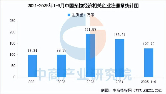 中商产业研究院发布的《2025-2030年中国宠物经济市场前景预测及未来发展趋势报告》显示,中国宠物经济相关企业注册量自2021年起持续攀升,2023年达191.57万家峰值,2025年1-9月已注册127.72万家,政策支持、消费升级及产业链集群效应共同驱动行业扩张,展现强劲发展动能。