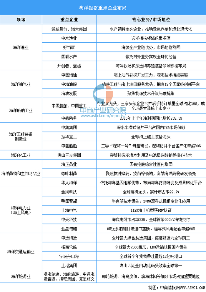 我国海洋经济企业布局呈现央企主导、龙头引领的格局。中国船舶、中集集团在高端海工装备领域处于领先地位,中国海油主导深海油气开发,中远海运、招商轮船垄断全球航运,金风科技、中天科技称雄海上风电。各细分领域已形成完整的产业链覆盖,并加速向海洋药物、数字海洋等新赛道拓展。