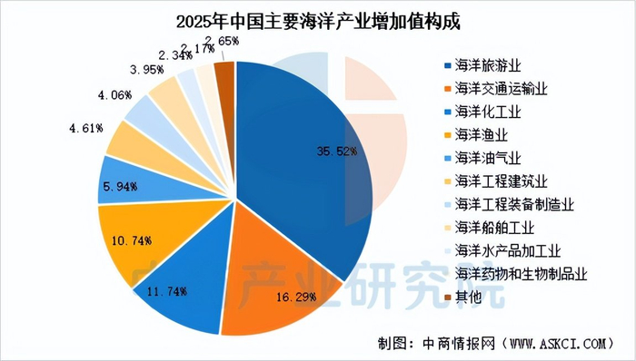 海洋产业主要包括海洋渔业、沿海滩涂种植业、海洋水产品加工业、海洋油气业、海洋矿业、海洋盐业、海洋船舶工业、海洋工程装备制造业、海洋化工业、海洋药物和生物制品业、海洋工程建筑业、海洋电力业、海水淡化与综合利用业、海洋交通运输业、海洋旅游业等。2025年,占比最大的是海洋旅游业,达到35.52%。其次是海洋交通运输业和海洋化工业,分别占比16.29%和11.74%。