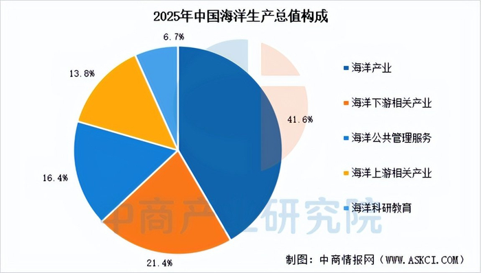 依据《海洋及相关产业分类》(GB/T 20794-2021),海洋经济包括海洋产业、海洋科研教育、海洋公共管理服务、海洋上游相关产业和海洋下游相关产业。2025年,占比最大的是海洋产业,达到41.6%。其次是海洋下游相关产业和海洋公共管理服务,分别占比21.4%和16.4%。