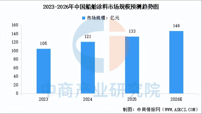 船舶涂料作为保护海洋装备、延长使用寿命的关键材料,市场规模持续扩大。中商产业研究院发布的《2025-2030全球与中国船舶涂料市场现状及未来发展趋势》显示,2024年中国船舶涂料市场规模达121亿元,同比增长15.17%,2025年市场规模约为133亿元。中商产业研究院分析师预测,2026年中国船舶涂料市场规模将增至146亿元。