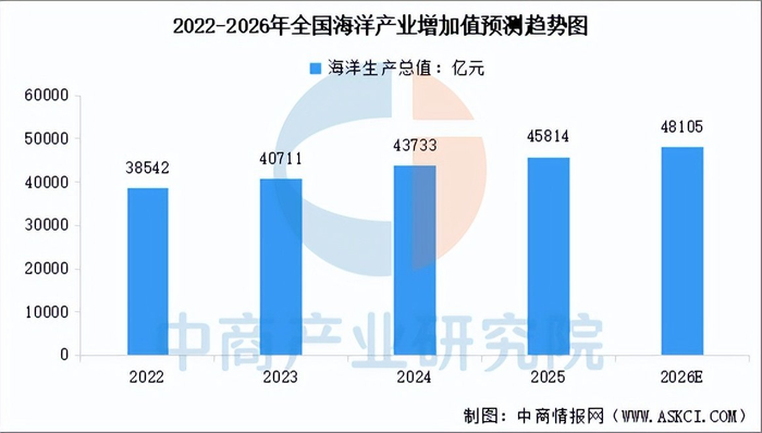 近年来,中国海洋传统产业平稳较快发展,海洋新兴产业不断培育壮大。中商产业研究院发布的《2025-2030年中国海洋经济产业深度研究及发展前景投资预测分析报告》显示,2025年全国15个海洋产业增加值达到45814亿元。中商产业研究院分析师预测,2026年全国海洋产业增加值将达到48105亿元。