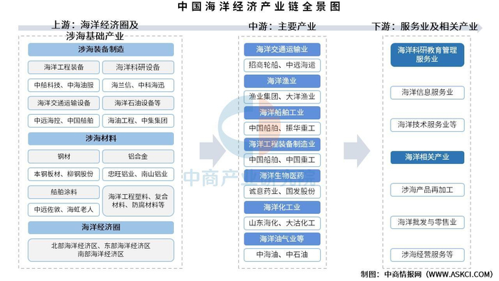 海洋经济产业链上游涵盖海洋经济圈及涉海基础产业,海洋经济圈主要包括北部、东部和南部三大海洋经济圈,涉海基础产业则分为涉海装备制造与涉海材料两大类;中游为海洋经济的主要产业,包括海洋旅游业、海洋交通运输业、海洋化工业、海洋渔业、海洋油气业、海洋工程建筑业等;下游为服务业及相关产业,主要包括海洋科研教育管理服务业和海洋相关产业。