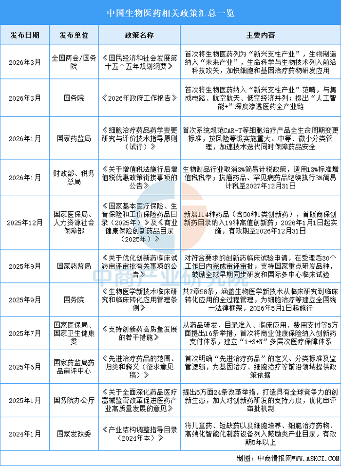 生物医药产业作为发展新质生产力的重要方向,受到中央及地方政府的高度重视。近年来,政府相关部门发布了《国民经济和社会发展第十五个五年规划纲要》《2026年政府工作报告》《细胞治疗药品药学变更研究与评价技术指导原则(试行)》等支持政策,这些政策的实施将进一步完善生物医药产业的发展环境,推动中国生物医药行业的高质量发展。