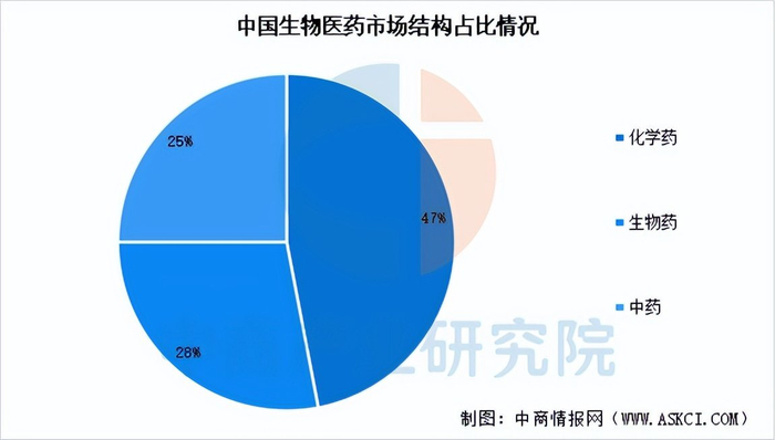 中国生物医药市场中,化学药占据主导地位,市场占比约为47%,主要得益于仿制药的规模效应和带量采购政策的推动;生物药作为增长最快的领域,占比约为28%,在单克隆抗体、疫苗、基因治疗等创新领域表现突出;中药在政策支持和健康消费升级的背景下,市场份额保持稳定,占比约为25%,其现代化和国际化进程正在加快。