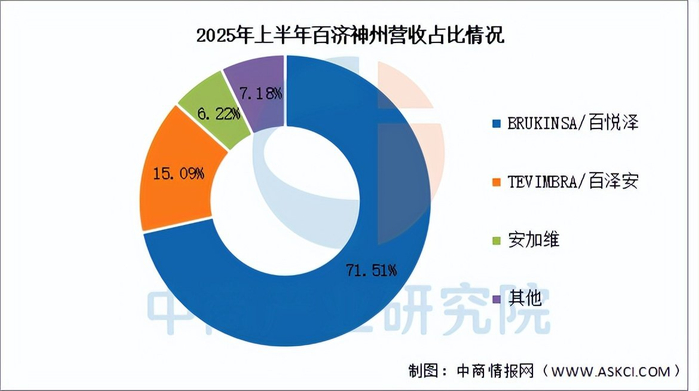 2025年前三季度实现营业收入275.95亿元,同比增长44.2%;实现归母净利润11.39亿元,同比增长130.89%。2025年上半年主营产品包括BRUKINSA/百悦泽、TEVIMBRA/百泽安、安加维,营收分别占整体的71.51%、15.09%、6.22%。