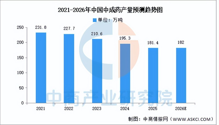 中商产业研究院发布的《2025-2030年中国生物医药行业分析及发展预测报告》数据显示,受到政策强力调控、市场结构变迁与产业主动升级三者共同作用的影响,2025年中成药产量达181.4万吨,同比下降7.7%。中商产业研究院分析师预测,在“严监管、强规范、促创新”的政策组合拳下,预计全年产量将延续2025年的下行趋势,但降幅收窄,围绕180万吨左右波动。