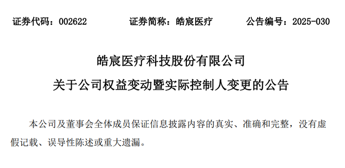 近日,皓宸医疗(002622.SZ)发布公告,第一大股东汇垠日丰执行事务合伙人汇垠澳丰,与北京首拓融汇合作协议正式解除,导致公司控制权发生根本性变动,皓宸医疗进入'无实际控制人'时代。