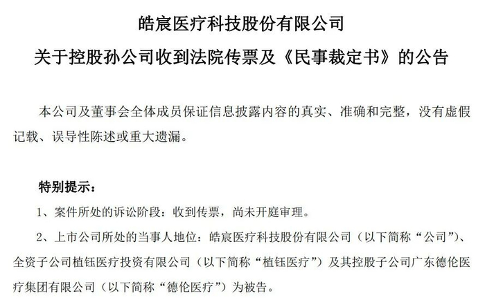今年9月18日,皓宸医疗收到浙江浙捌仙女湖企业发送的《债权转让通知暨债务催收函》,被要求在5日内清偿全部债务及相关费用。