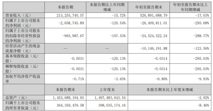 今年10月30日,公司披露的三季报显示,前三季度实现营业收入5.27亿元,同比下降17.03%;归母净利润亏损2641万元,同比大幅下降295.68%,而去年同期仍盈利1349.67万元;扣非归母净利润亏损2452万元,同比下降288.77%。
