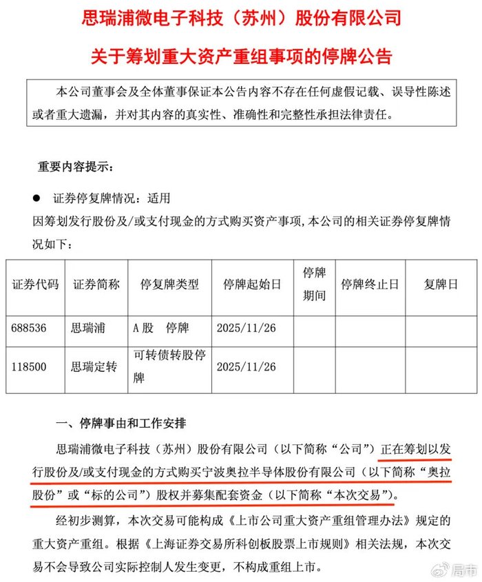11月25日晚间,思瑞浦(688536.SH)刊登公告,宣布筹划重大资产重组并于11月26日开市起停牌。