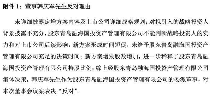 但在1月15日召开的董事会上,青岛融海委派的董事韩庆军却对16项议案全部投出反对票,并且陈述了理由。