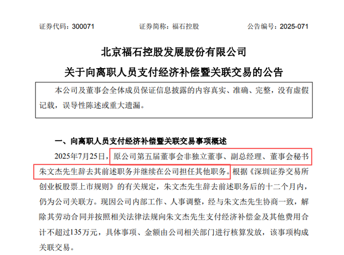近日,福石控股发布《关于向离职人员支付经济补偿暨关联交易的公告》,公告称,因公司内部工作、人事调整,经与朱文杰先生协商一致,解除其劳动合同并按照相关法律法规向朱文杰先生支付经济补偿金及其他费用合计不超过135万元。