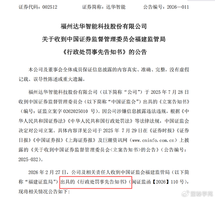 近日,达华智能公告收到福建证监局《行政处罚事先告知书》,公司因为信息披露违法违规被监管给予重罚。