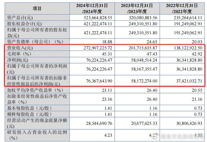 从经营业绩来看,弥富科技近年来表现出稳定的增长态势。2022年至2024年,公司营业收入从1.38亿元增长至2.73亿元,归母净利润从3634.18万元增长至7622.42万元。