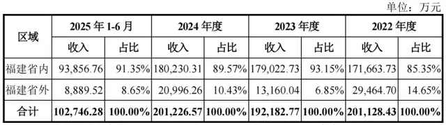 招股书显示,马矿股份绝大部分收入都来自福建省内。2022-2024年、2025H1,福建省内的收入分别为17.17亿元、17.90亿元、18.02亿元和9.39亿元,占比高达85.35%、93.15%、89.57%和91.35%;省外收入分别为2.95亿元、1.32亿元、2.10亿元和0.89亿元,占比分别为14.65%、6.85%、10.43%和8.65%。
