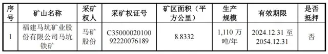 招股书披露,马坑铁矿矿区面积为8.83平方公里,生产规模1110万吨/年,采矿权有效期为2024年末至2054年末,期限合计30年。据银莕财经粗略计算,按现有产能持续开采,30年内可消耗资源量约3.33亿吨,已略高于当前3.30亿吨的铁矿石保有资源储量。