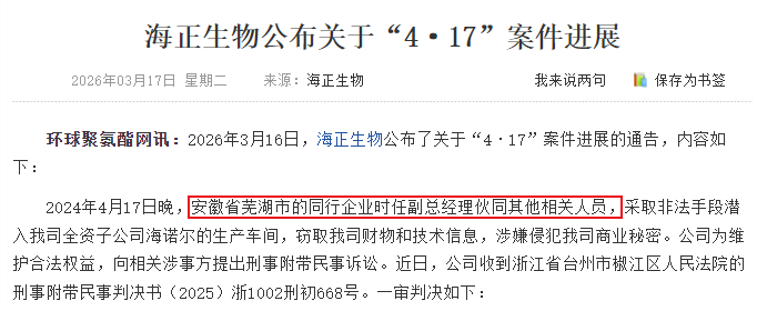 3月14日,A股科创板聚乳酸龙头海正生材的一份诉讼事项进展公告,称其侵犯商业秘密一案已经一审宣判,公司获赔500万。侵权方及相关责任人同时被追究刑事责任。