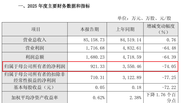 近日,海正生材发布了2025年业绩快报,结果业绩大暴雷:营收8.51亿,同比微增0.76%;归母净利润却只有921.33万,同比大降74.05%。