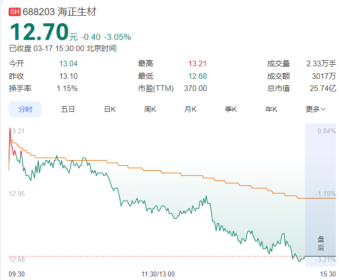 但官司赢了,公司股价却跌了。3月16日,海正生材股价微涨0.69%,17日,海正生材股价高开低走,截至收盘跌3.05%,报12.70元。