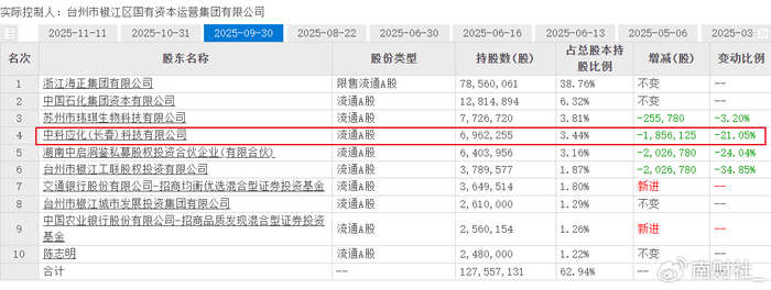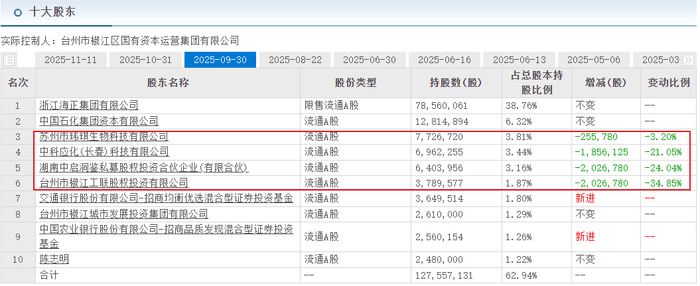上市多年,长春应化科技持股份额一直没有变动,但在2025年第二季度,长春应化科技开始陆续减持海正生科股份,持股比例从4.54%减持至3.44%,不过目前仍是第四大股东。