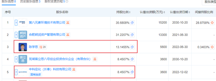 值得一提的是,普立思的股东中,也有陈学思和长春应化所的身影。天眼查显示,普立思的控股股东为第八元素环境技术有限公司,持股35.68%,第二大股东合肥朗润资产管理有限公司持股31.22%,该公司背后的实控人也是第八元素。陈学思和中科应化(长春)科技有限公司分别持股13.145%、8.45%。