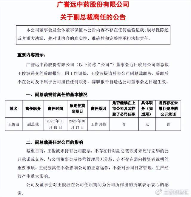 仅三个月后,王俊波再次辞去副总裁职务,离职后不再担任广誉远任何职务,其原定任期本应至2026年1月17日结束。