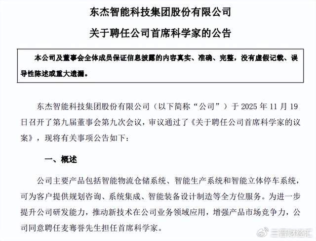 东杰智能表示,聘任麦骞誉为首席科学家,有助于公司进一步提升研发能力,推动新技术在公司业务领域应用,增强产品市场竞争力。