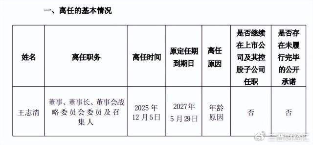 公告显示,潞安环能董事会收到董事长王志清递交的书面辞职报告,因到法定退休年龄,王志清申请辞去公司第八届董事会董事、董事长、董事会战略委员会委员及召集人职务,辞职后,王志清将不在公司担任任何职务。