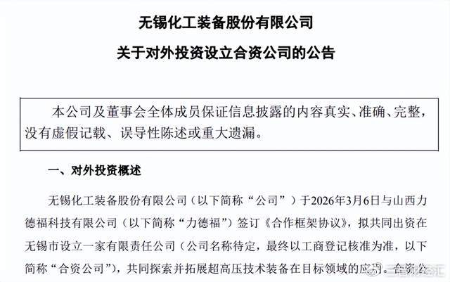 3月6日,无锡上市公司锡装股份(无锡化工装备股份有限公司,001332.SZ)发布公告,宣布与山西力德福科技有限公司(以下简称“山西力德福”)签订《合作框架协议》。