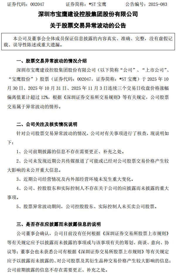 11月4日,*ST 宝鹰发布《于股票交易异常波动的公告》,就相关事项进行详细说明(见截图)。