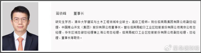 这是招商蛇口背景干部调入中国南山集团的又一案例。2025年以来,已有多名招商蛇口核心管理人员履新中国南山集团;其中2025年11月,原招商蛇口董事长、现招商局集团副总经理蒋铁峰出任中国南山董事长,正式分管该平台。