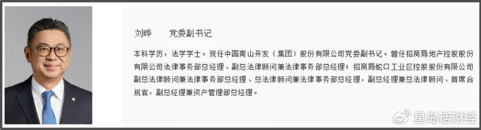 而此次赴任的刘晔,同样是招商蛇口体系内的资深管理者,历任招商蛇口副总法律顾问兼法律事务部总经理、总法律顾问兼法律事务部总经理,副总经理兼总法律顾问、首席合规官,副总经理兼资产管理部总经理等职务。市场分析认为,刘晔有望将招商蛇口的合规管理、风险管理及资产管理经验,融入中国南山的党建工作与企业经营各环节。