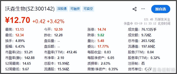 3月19日,沃森生物正式复牌后便高开高走,截至当天午市休盘,沃森生物报12.70元/股,涨幅3.42%,总市值203.12亿元。