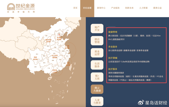 资料显示,世纪金源成立于2001年,是一家综合性跨行业的企业集团,旗下拥有地产开发、酒店文旅、商业运营、生活服务、大健康、儿童与教育等产业,其中以腾云大健康为核心主体的大健康产业,涉足医院、养老、医疗器械等。