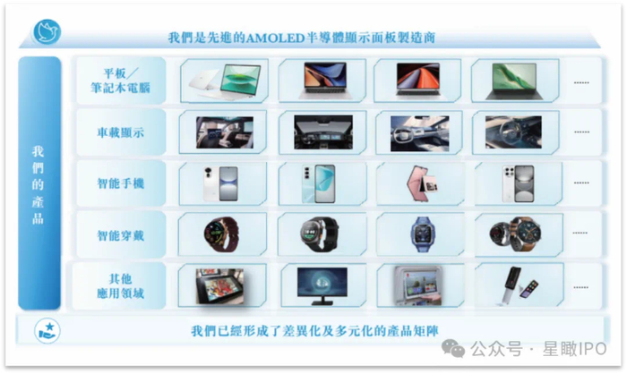 和辉光电于2014年投产第4.5代线、2019年量产第6代线,形成刚性、柔性、Hybrid AMOLED“刚柔并济”的产品布局,其面板尺寸覆盖0.95英寸至27英寸,应用于平板/笔记本计算机、智能手机、智能穿戴、车载显示四大领域。