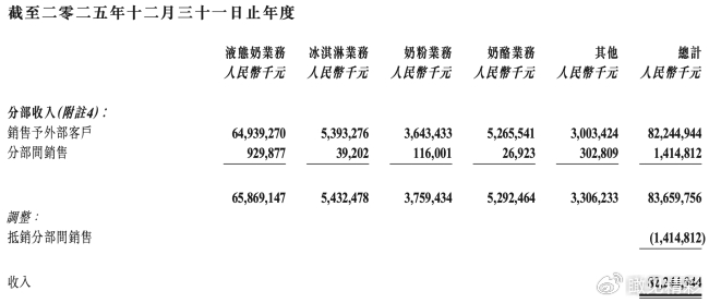 也就是说,在2025年,蒙牛乳业仅液态奶业务的收益就减少了81.263亿元,成为整体营收下滑的“罪魁祸首”。