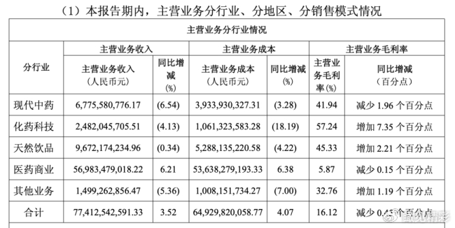白云山去年营收有所增长,主要靠占公司四分之三收入来源的医药商业板块。这部分业务毛利率却只有5.87%,属于只赚吆喝不赚钱。真正赚钱的还是中药、化药、天然饮品这几个板块。但如今,几块曾经的压舱石都出现了动摇,白云山这艘船自然很难稳住。