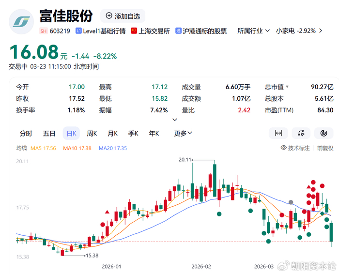 再看二级市场的定价。截至2026年3月20日,富佳股份市盈率(TTM)约为91.85倍,而小家电行业平均水平是61.29倍。市场显然已经将储能和机器人的增长预期打入了股价。