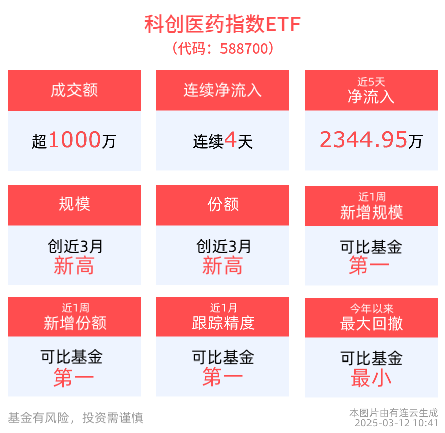 从资金净流入方面来看,科创医药指数ETF近4天获得连续资金净流入,最高单日获得1403.34万元净流入,合计“吸金”2344.95万元。