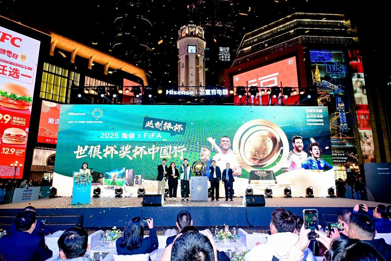 3月11日晚,“此刻捧杯冠军之夜——2025海信FIFA世俱杯奖杯&重庆解放碑舞台盛典”在重庆市解放碑广场隆重举行,2025国际足联俱乐部世界杯(以下简称“世俱杯”)奖杯震撼亮相,这也是世俱杯奖杯首次登陆中国。在海信、重庆百货、FIFA官员及孙继海等嘉宾的见证下,2025世俱杯奖杯登上了解放碑舞台,FIFA官方解锁奖杯,台上嘉宾共同完成“捧杯”仪式。