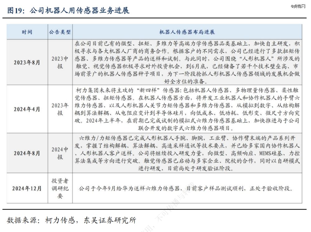 2023 年以来,公司以市场需求为导向,积极布局机器人及相关传感器产业。在六维力传感器领域,公司已完成人形机器人手腕、脚腕以及工业臂、协作臂末端的产品系列开发,掌握结构解耦、算法解耦和高速采样通讯等关键技术,并向多家国内协作机器人和人形机器人客户送样。在触觉传感器方面,公司已与多家企业、院校展开合作,并通过自主研发推进项目,目前产品处于研发验证阶段。