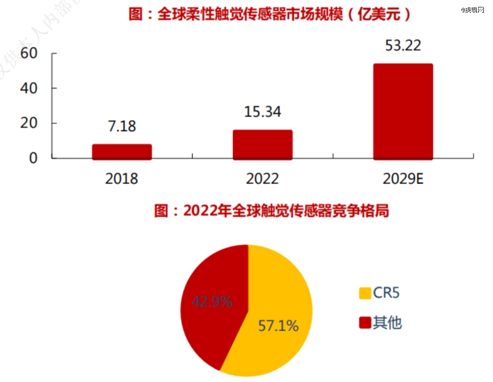 根据QYResearch,2029年全球柔性触觉传感器规模达到53亿美元,其中机器人触觉传感器空间将达到4.3亿美元。随着机器人技术路线的不断迭代,以及量产的到来,触觉传感器市场规模有望持续增长及超预期。全球柔性触觉传感器市场主要被海外企业占据,主要厂商包括Novasentis、Tekscan、Japan DisplayInc.(JDI)、Baumer、Fraba,根据QY Research,22年CR5市占率合计约57%。