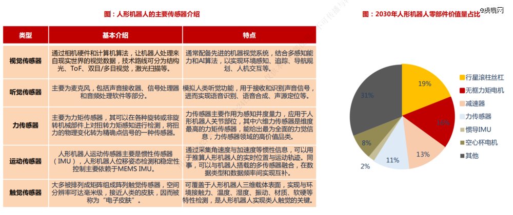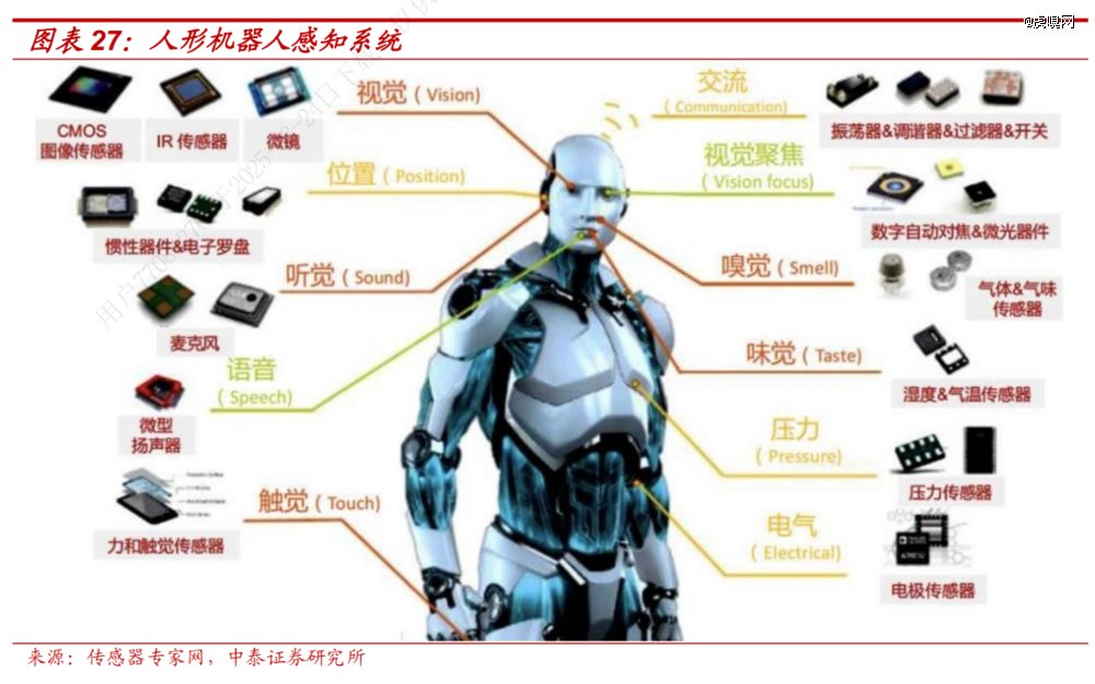 目前传感器方面的整体趋势是向多维度、高精度、高集成度、高延展性方向发展,高维力矩传感器和高维触觉传感器是传感器方面的当前研究重点。人形机器人对于传感器的需求增多,随着人形机器人逐步量产,有望推动传感器行业扩容。