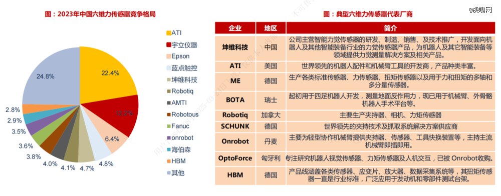 根据中商产业研究院的数据,2023年中国六维力传感器主要被外资企业占据,ATI作为市占率最高的企业,2023年中国市占率超过了20%。国内企业如宇立仪器、坤维科技、蓝点触控等正在积极开拓六维力传感器市场。随着人形机器人产业的加速发展,其他厂商也正在逐步布局六维力传感器,看好国内厂商在未来的市占率逐步提升。