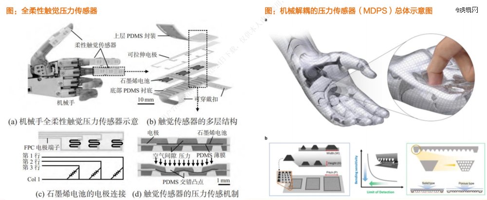 触觉是机器人的重要感知方式,柔性传感器市场空间广阔。所谓“柔性”是指触觉传感器具有类似人类皮肤的物理特性,即具备一定的柔度可覆盖在载体表面测量受力信息,从而感知目标对象的特征信息。因此,柔性压力传感技术的发展对机器触觉感知领域至关重要。